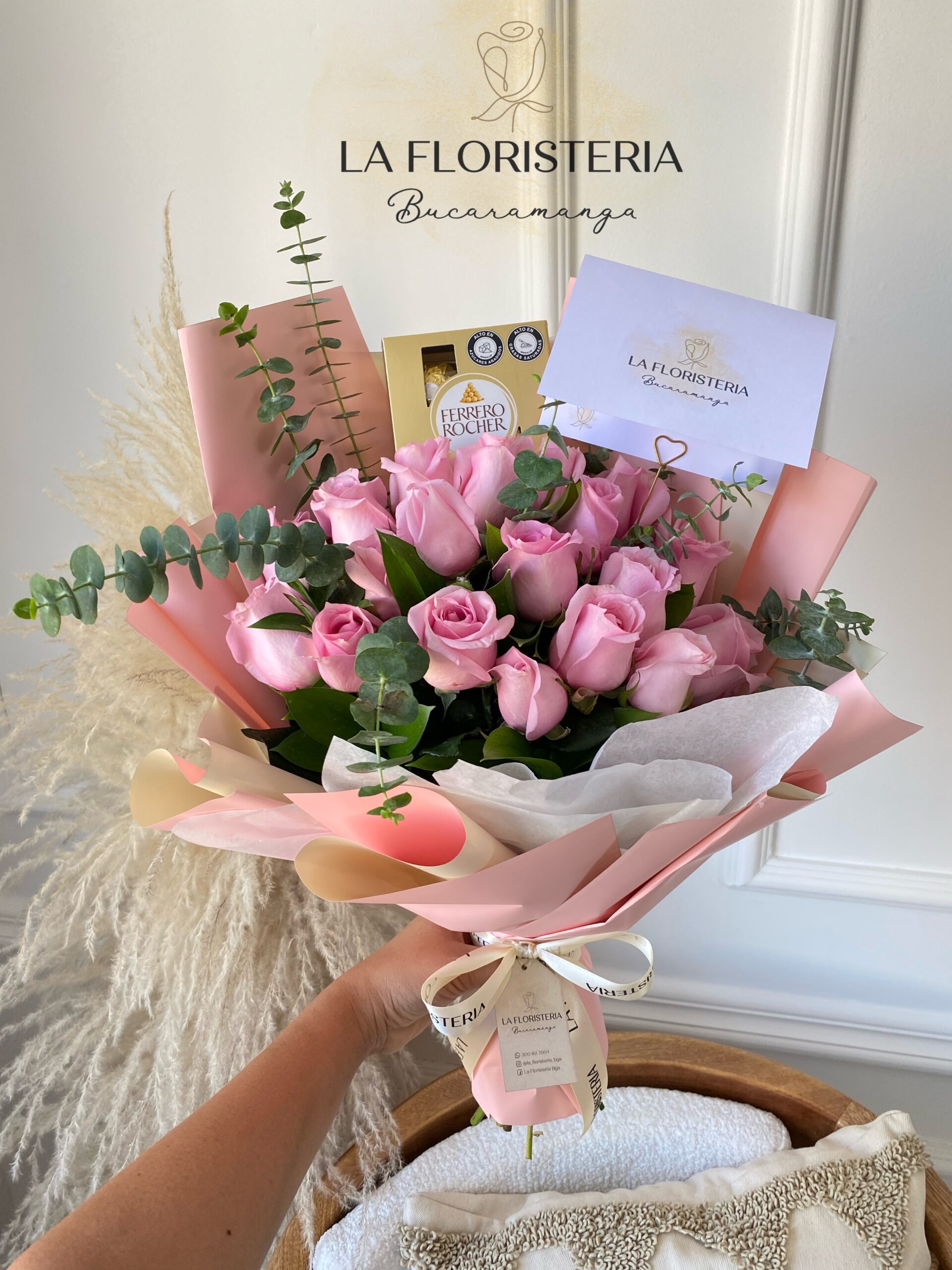 Bouquet de rosas y follajes verdes como eucalipto y ruscus acompañado de chocolates Ferrero Rocher x4, incluye tarjeta personalizada, pídelo en tu color de rosas favorito