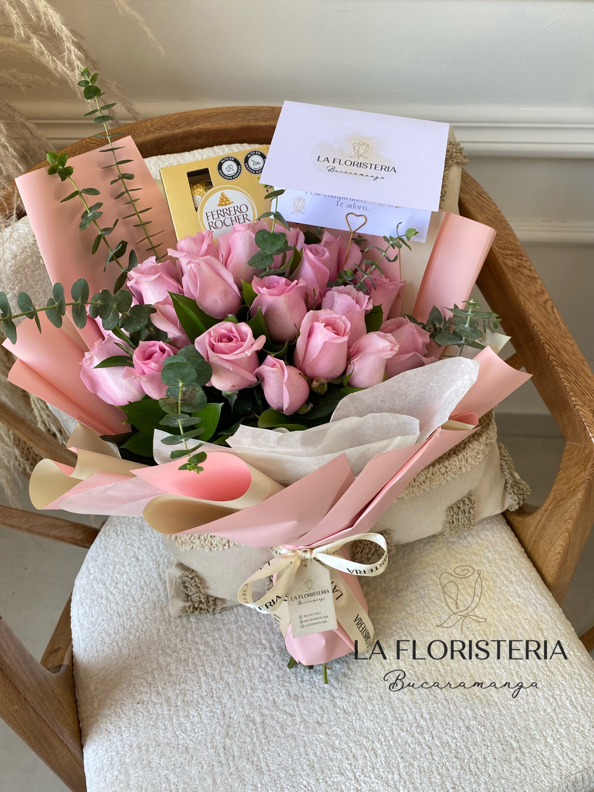 Bouquet de rosas y follajes verdes acompañado de chocolates Ferrero Rocher, incluye tarjeta personalizada