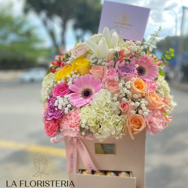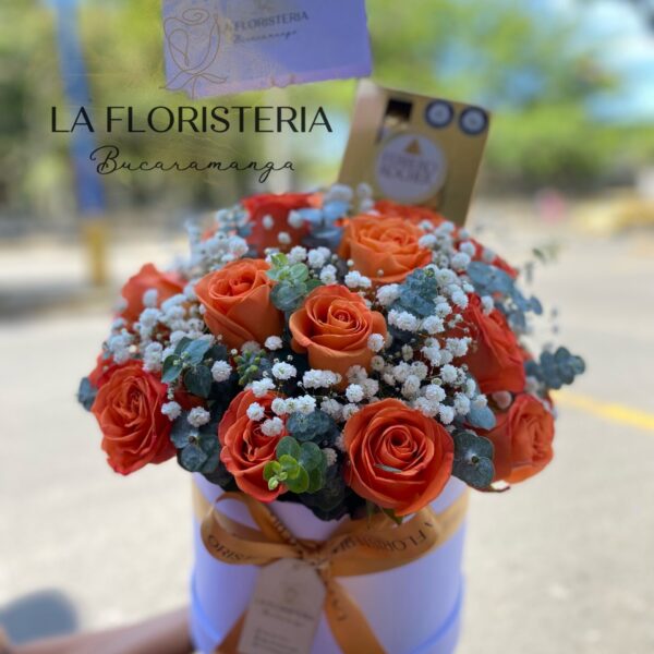 Caja I ❤️ U con 24 unidades de rosas del color que prefieras acompañada de chocolates Ferrero rocher, tapa personalizada con la frase que elijas, incluye tarjeta