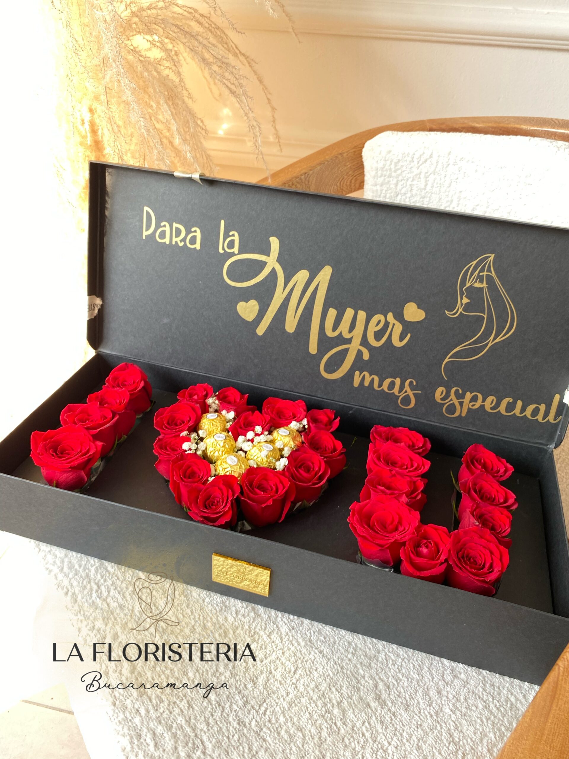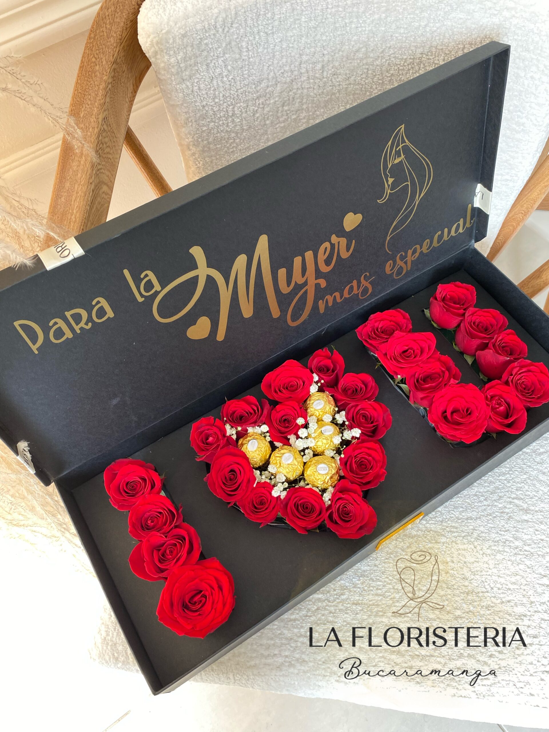 Caja I ❤️ U con 24 unidades de rosas y chocolates ferrero rocher, incluye tarjeta personalizada.